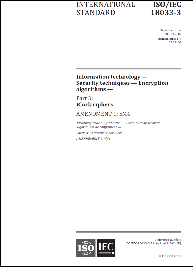 2021年6月,我國SM4分組密碼算法作為ISO/IEC 18033-3:2010/AMD1:2021《信息技術(shù) 安全技術(shù) 加密算法 第3部分:分組密碼 補(bǔ)篇1:SM4》正式發(fā)布。ISO/IEC 18033-3:2010包含了64位分組密碼算法(TDEA、MISTY1、CAST-128、HIGHT)和128位分組密碼算法(AES、Camellia、SEED),新發(fā)布的補(bǔ)篇主要包含我國的SM4分組密碼算法。