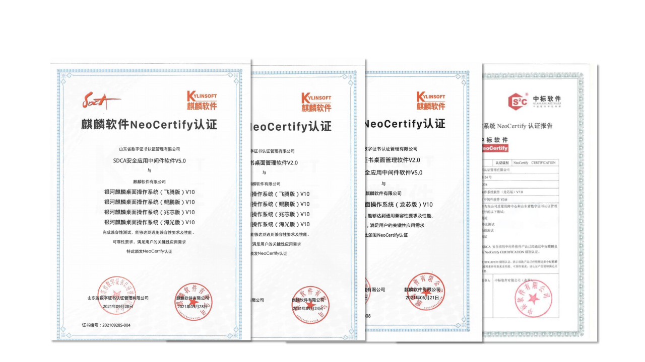 近日,經(jīng)過多次的嚴(yán)格聯(lián)合測試后,山東CA旗下的SDCA安全應(yīng)用中間件系列、SDCA桌面管理軟件系列分別獲得麒麟軟件在飛騰、鯤鵬、龍芯、兆芯、海光等5個國產(chǎn)處理器平臺上的NeoCertify認(rèn)證,并與統(tǒng)信桌面操作系統(tǒng)V20在飛騰、鯤鵬、龍芯、兆芯、海光、海思等6個國產(chǎn)芯片廠商9款處理器平臺上完成了通用軟硬件適配認(rèn)證。測試表明,山東CA上述產(chǎn)品與銀河麒麟及中標(biāo)麒麟桌面操作系統(tǒng)、統(tǒng)信桌面操作系統(tǒng)V20在主流國產(chǎn)處理器平臺上運(yùn)行穩(wěn)定,能夠達(dá)到通用兼容性要求及性能、可靠性要求,滿足用戶的關(guān)鍵性應(yīng)用需求。