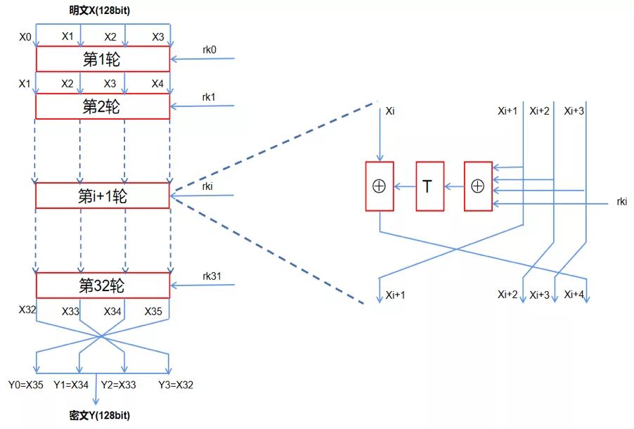 SM4密碼算法:算法采用32輪非線性迭代結(jié)構(gòu)。解密算法與加密算法的結(jié)構(gòu)相同,只是輪密鑰的使用順序相反,解密輪密鑰是加密輪密鑰的逆序。