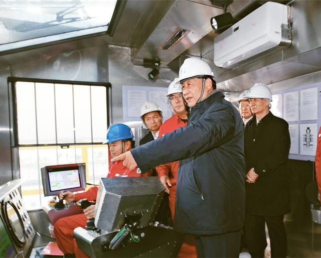 2021年10月22日下午,中共中央總書記、國家主席、中央軍委主席習(xí)近平在山東省濟(jì)南市主持召開深入推動黃河流域生態(tài)保護(hù)和高質(zhì)量發(fā)展座談會并發(fā)表重要講話。這是座談會前,習(xí)近平21日下午在位于東營市萊州灣的勝利油田萊113區(qū)塊考察時,登上二層鉆井平臺,察看鉆井自動化設(shè)備。 新華社記者 李學(xué)仁/攝