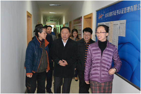 2月3日上午,省經(jīng)信委李世瑛副主任在張忠軍副巡視員、李向東處長(zhǎng)、趙宇副處長(zhǎng)陪同下,到山東CA公司視察調(diào)研并指導(dǎo)工作。李世瑛主任認(rèn)真聽取了山東CA工作情況匯報(bào),詳細(xì)觀看了相關(guān)產(chǎn)品服務(wù)功能演示,對(duì)山東CA的下一步建設(shè)與規(guī)劃提出了建議和要求。